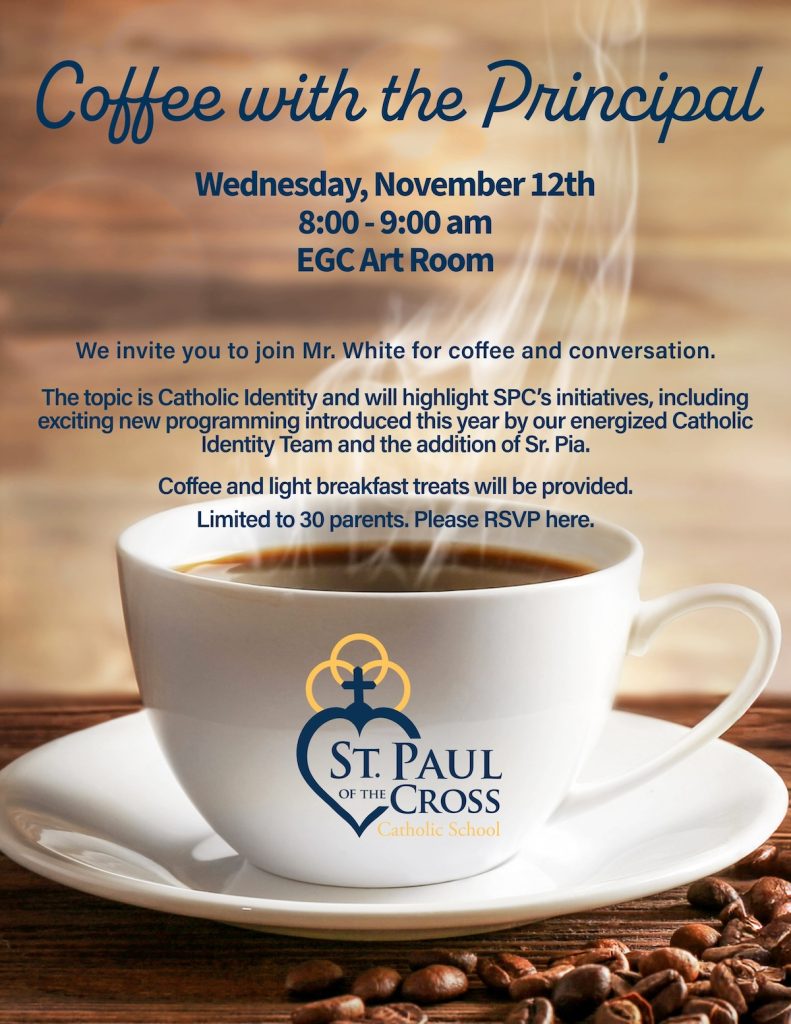 We’re also looking forward to our first Coffee with the Principal on Wednesday, November 12, from 8:00–9:00 a.m. Details and an RSVP link are included below. Our discussion will focus on Catholic Identity and the many ways our students encounter Christ throughout their time at SPC.