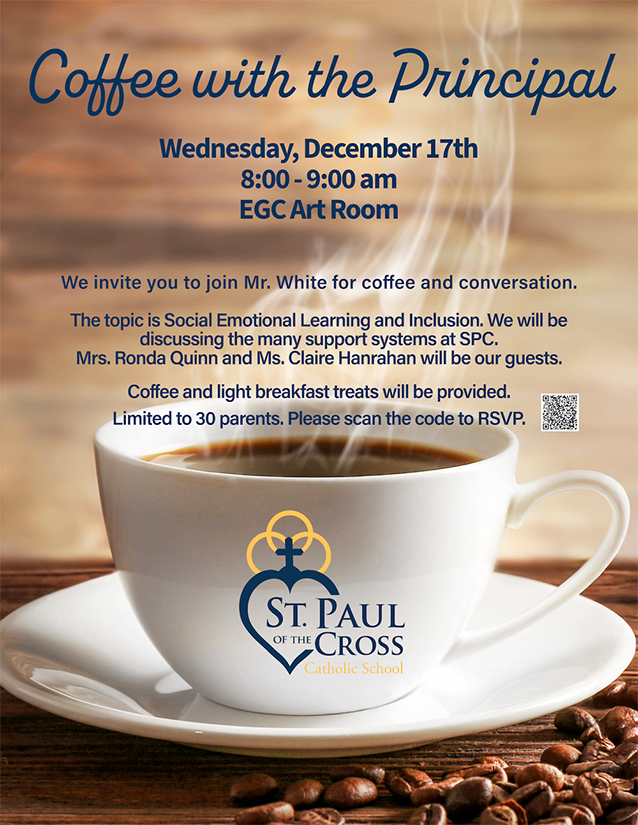 Join me on December 17, 8:00–9:00 am for our next Coffee With the Principal, featuring a conversation about Inclusion and Social & Emotional Learning at SPC.