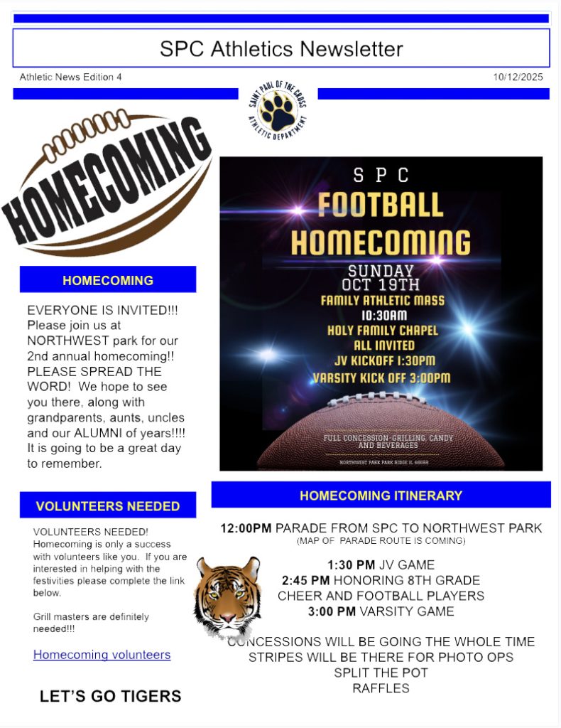 Welcome Parents! We hope everyone has had a safe, relaxing and joyful summer as we all eagerly anticipate the start of the 2025-2026 Saint Paul Tigers school year! A warm welcome to all the new families entering their first year with SPC and a hearty welcome back to all our returning Tigers!