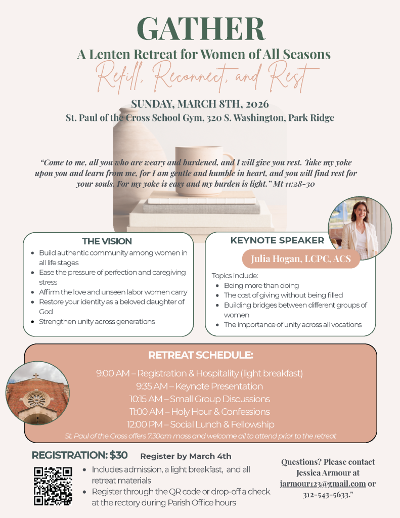 We have an active and vibrant parish and encourage everyone to read the weekly bulletins for Fr. James’ weekly letter and stay informed about all upcoming events and programs.