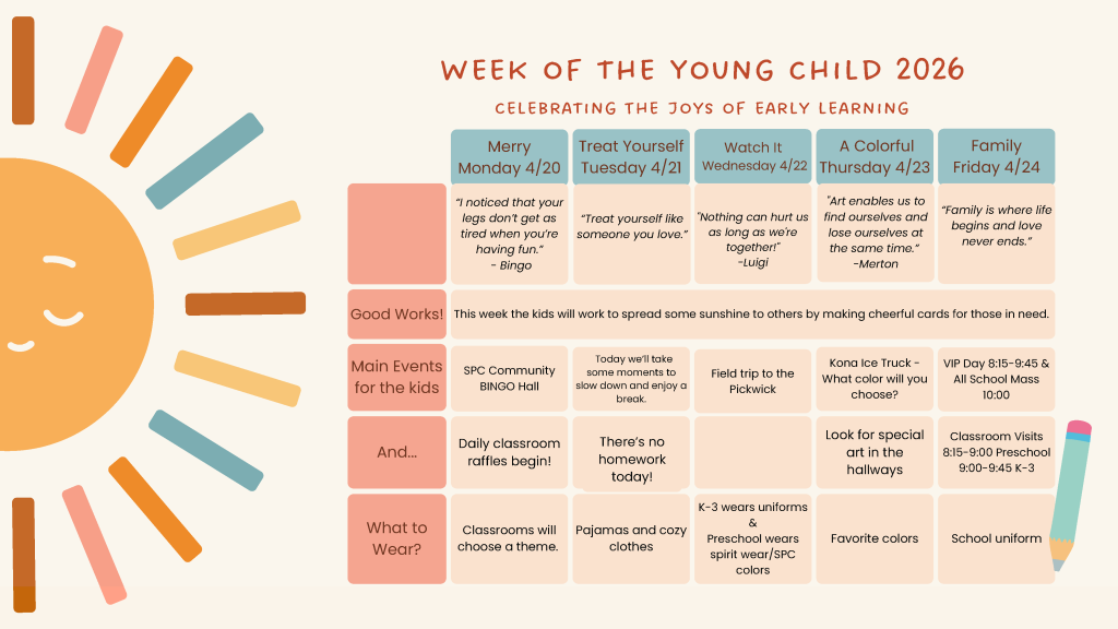 5Essentials Survey: This is a reminder that the 2026 Archdiocese of Chicago 5Essentials Parent Survey opened on Feb. 17, 2026. The survey window will close on March 20, 2026. SPC needs at least 50% of parents to respond to reach our survey goal.